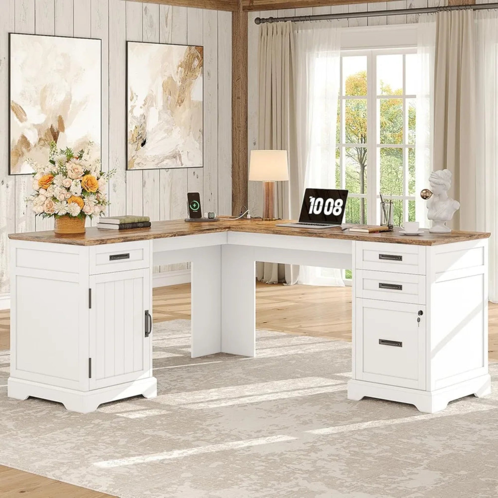 Regular price $325.98 USDSale price $325.98 USD Regular price $0.00 USDUnit price / perFarmhouse L Shaped Desk with Drawers, 67 Inch Executive Home Office Desk This executive L-shaped desk combines practical workspace with refined farmhouse aesthetics....