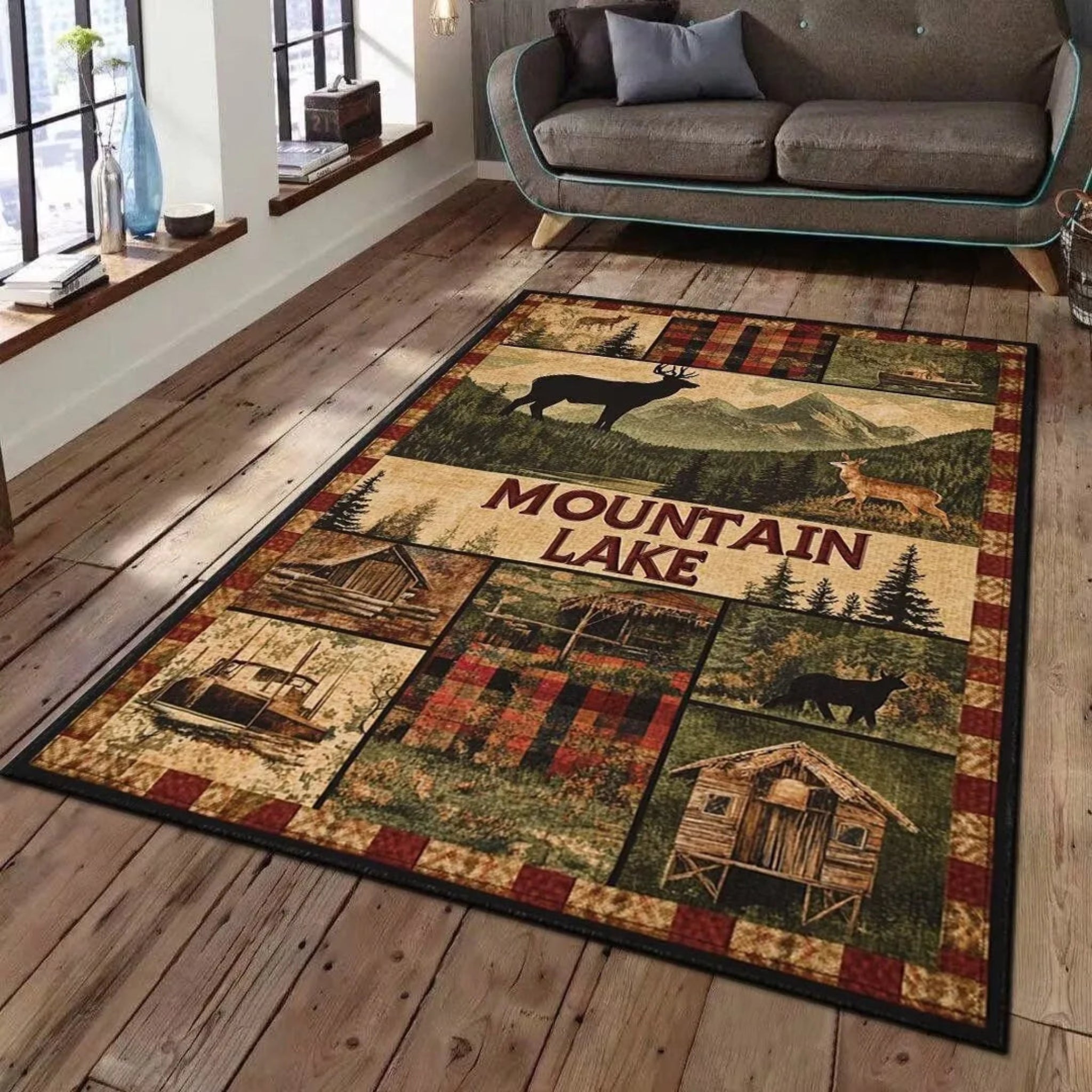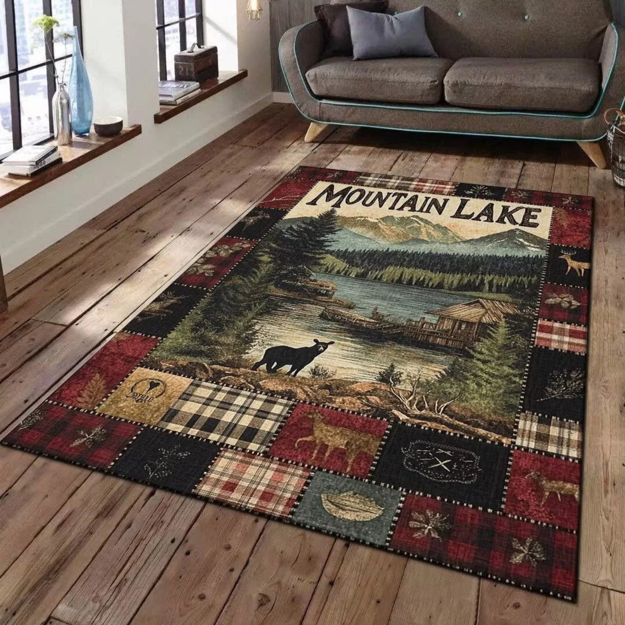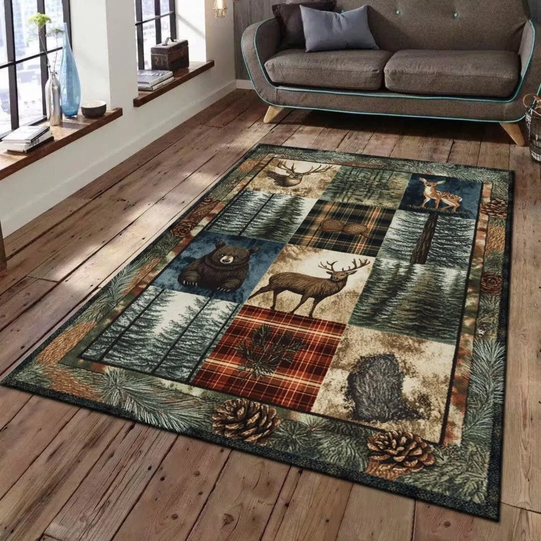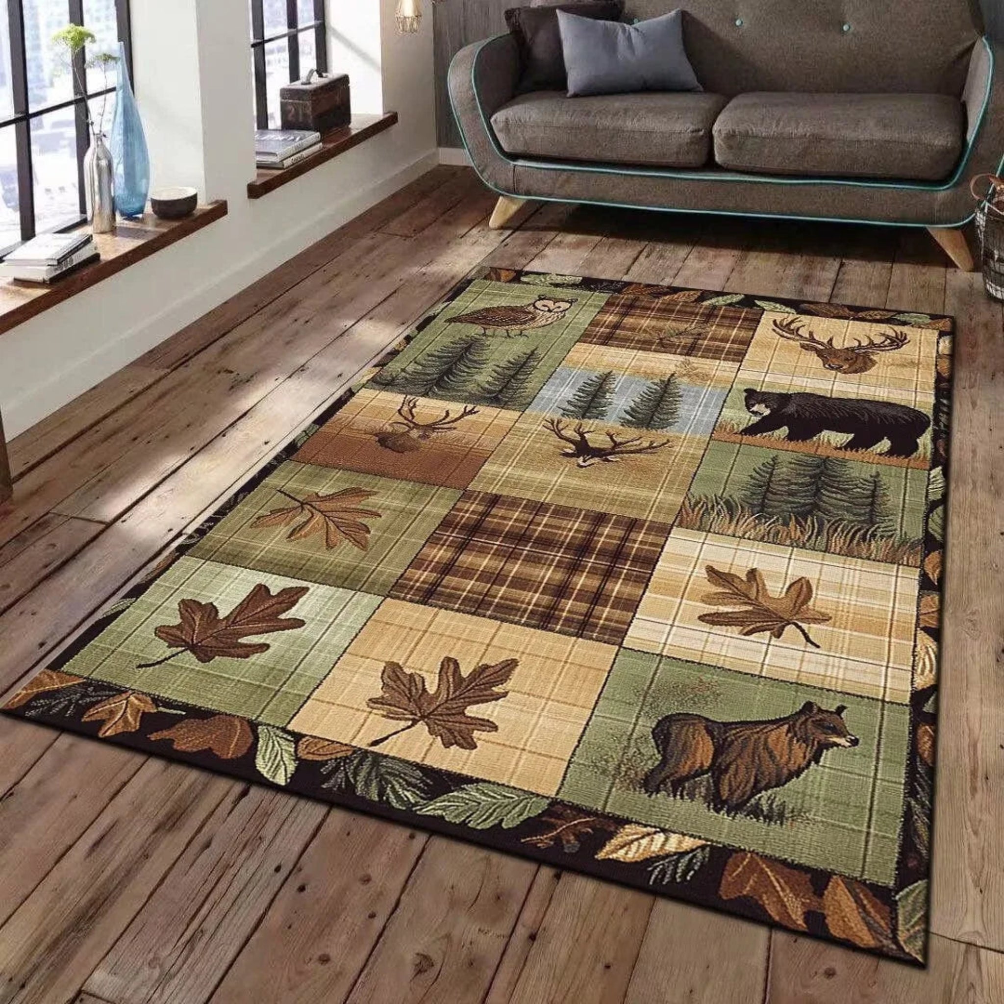 Buffalo Bear Rustic Rug Large Area Non-Slip Carpet Bear Elk Deer Wildlife Carpet      This modern rug is crafted from 100% polyester and features a...