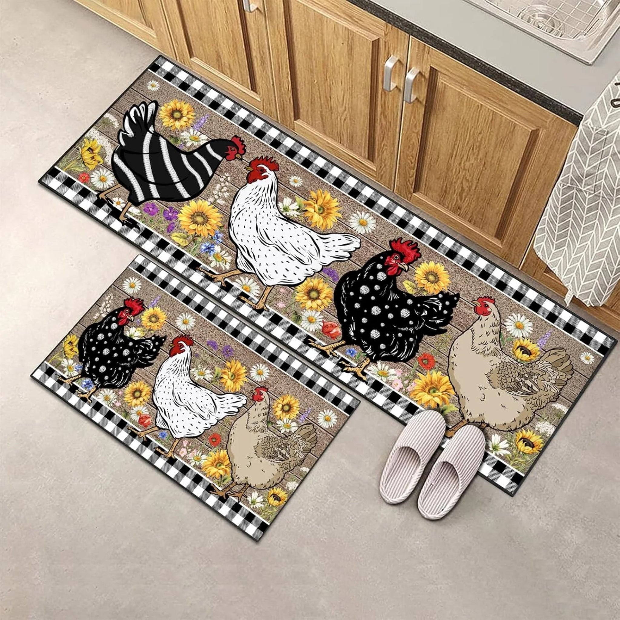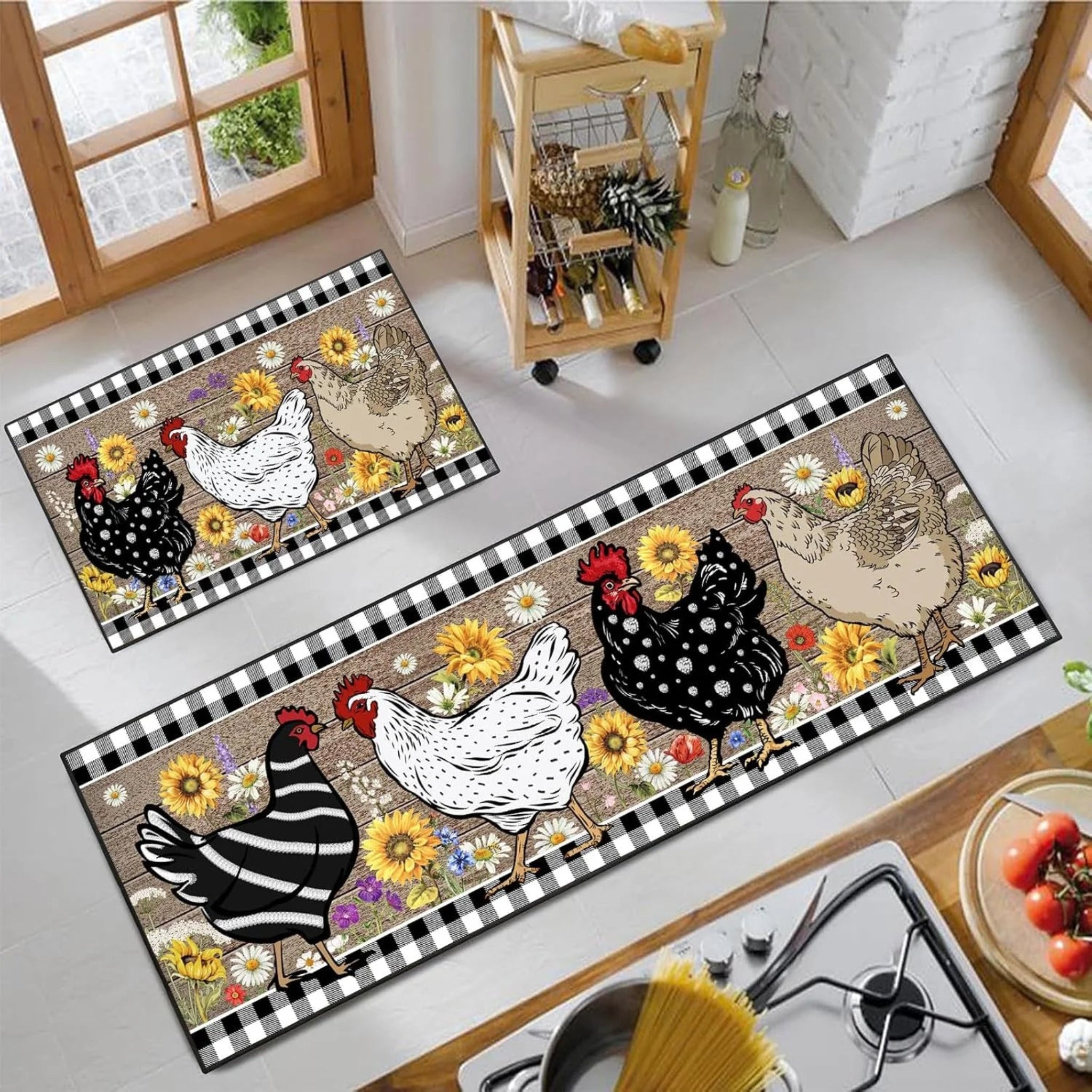 • Farmhouse Rooster Kitchen Rugs Non-Slip Farm Rooster Kitchen Mats Rustic Home Decor Low Profile Washable Floor Mat