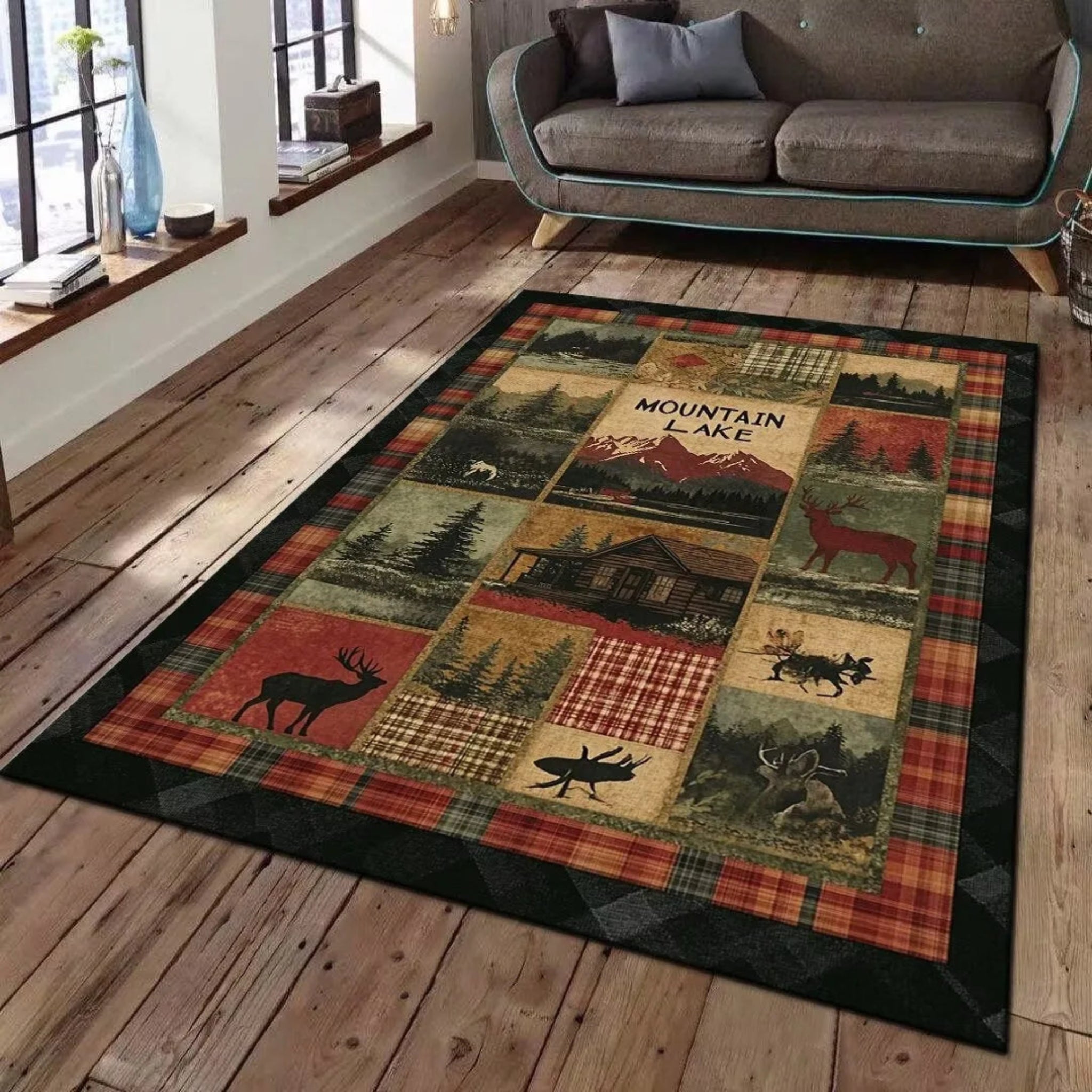 FRAMICS Farmhouse Area Rug 2x3, Rustic Cabin Lodge Deer Moose Bear Washable   This area rug features a printed design, suitable for various settings,...