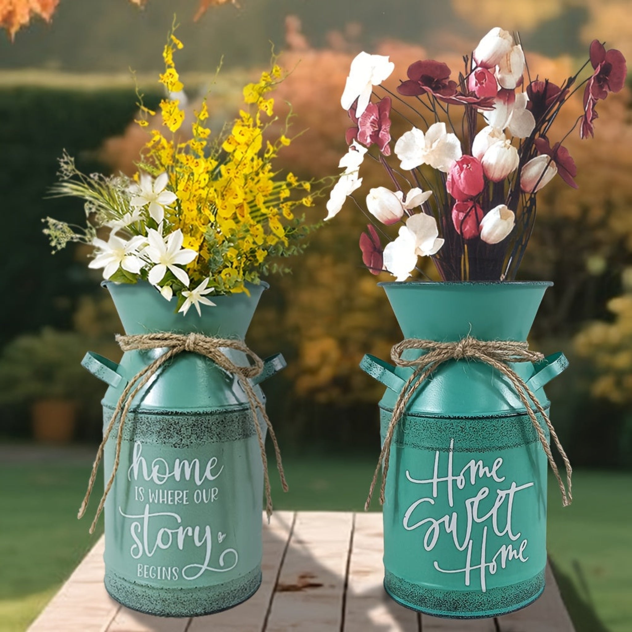 7 selectable blue and green printed village nostalgic and unique vases, small metal vases, retro milk cans, flower POTS, mini water bottles, decorative flower vases, farmhouse decorations for home, kitchen and bathroom, coffe