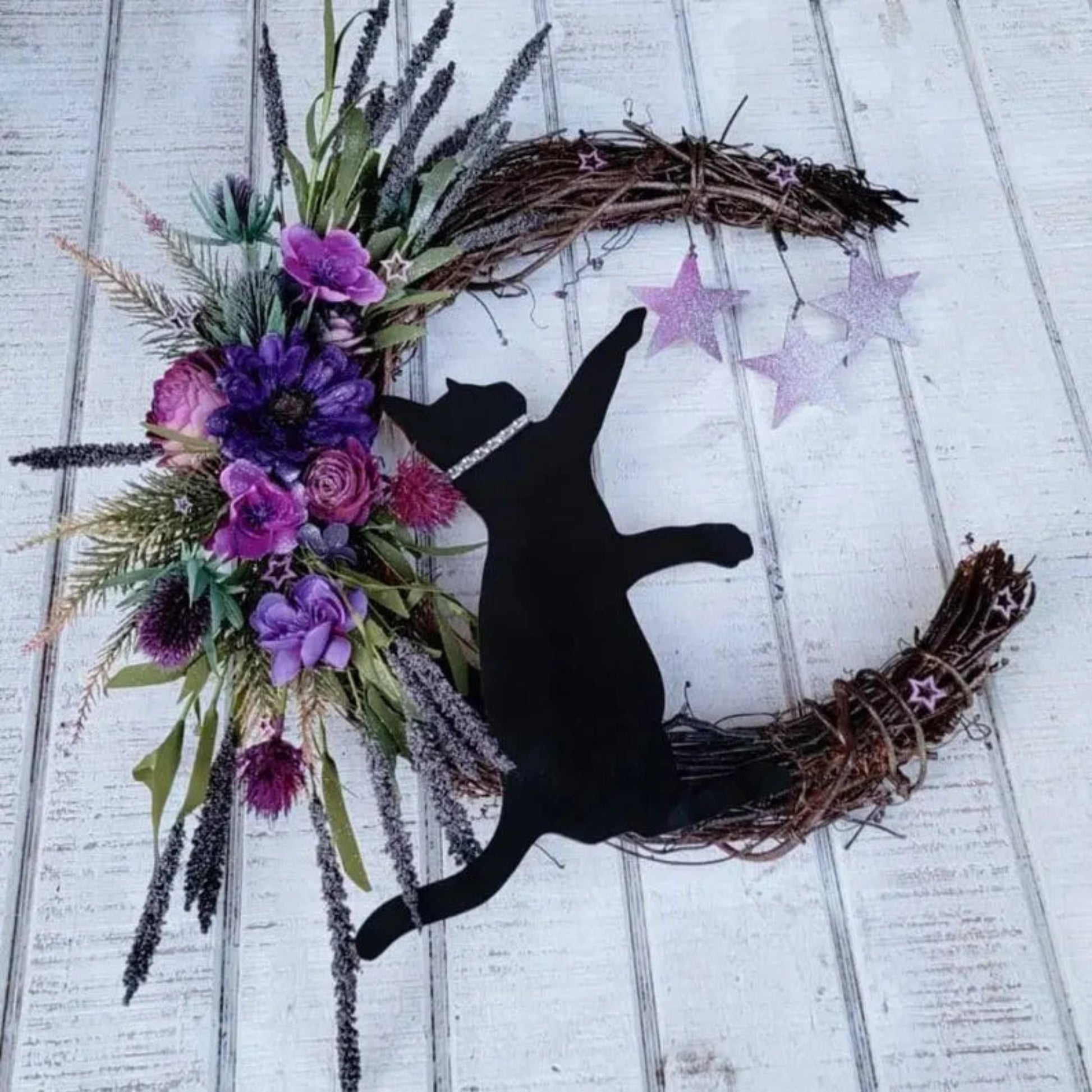 This wreath features a black rose rattan circle with a moon cat design, making it an ideal decoration for fall and Halloween. Its atmospheric style adds a festive charm to any door or wall, making it perfect for seasonal celebrations.