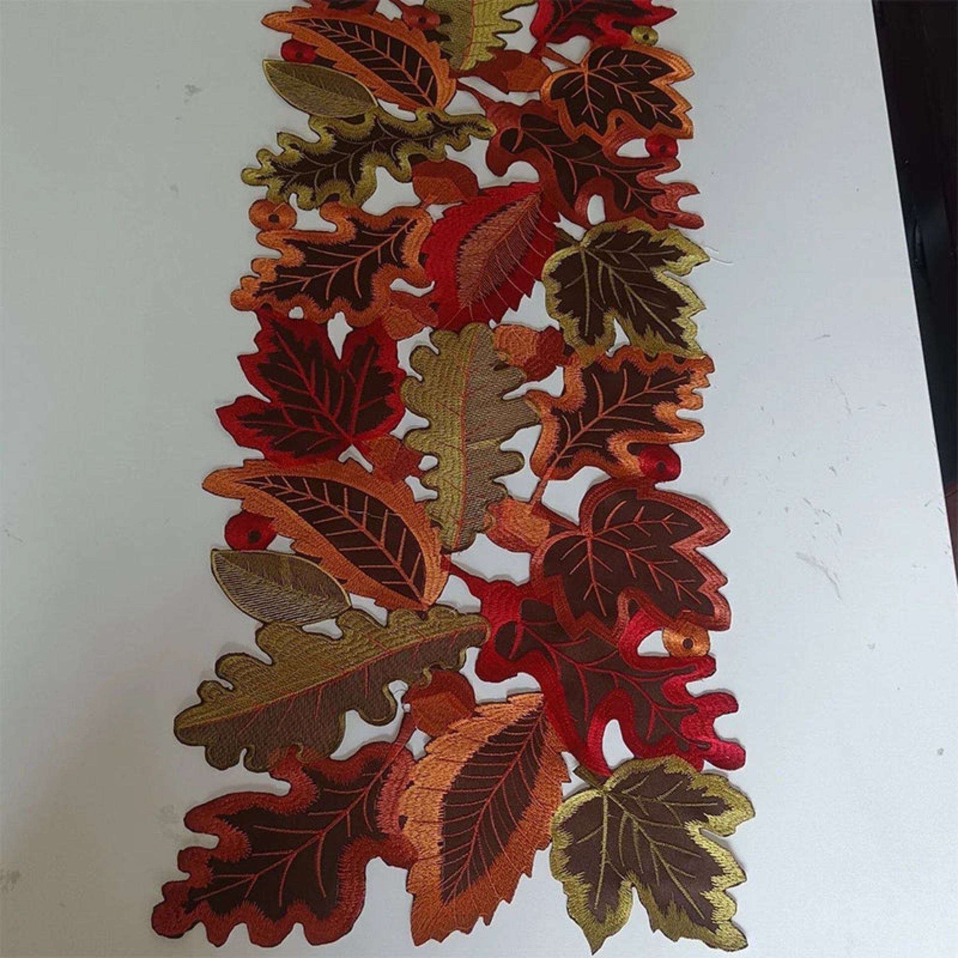 Expertly crafted with a knit technique, this table runner features embroidered maple leaves, adding an elegant touch to your fall harvest and Thanksgiving decorations.