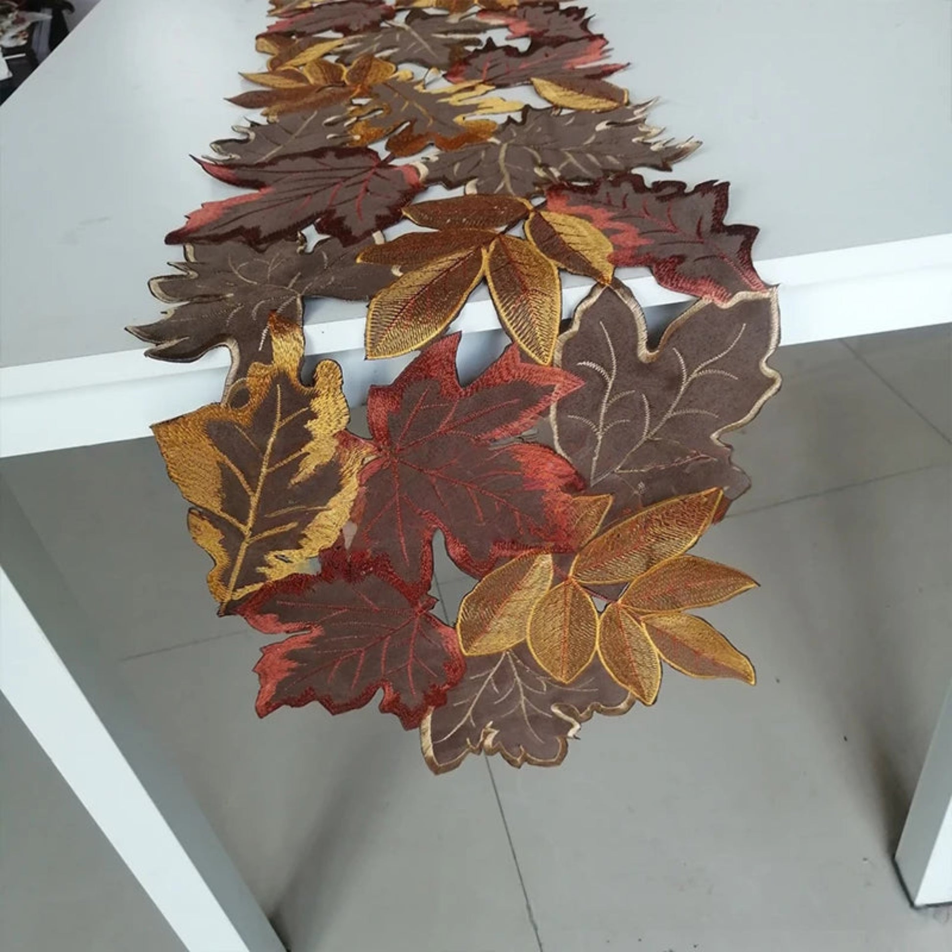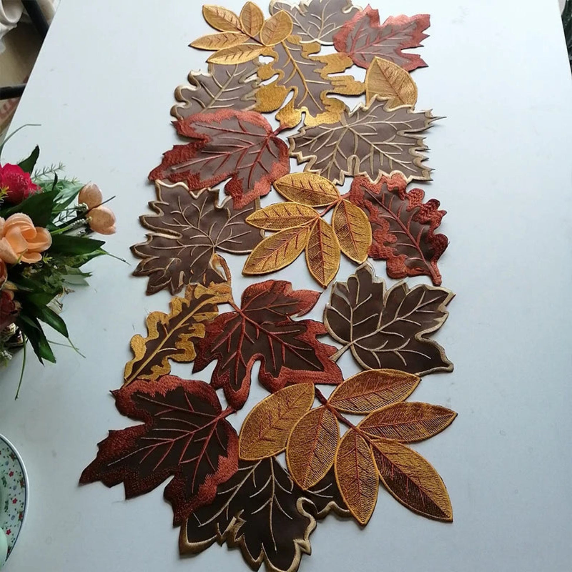 Autumn Maple Leaf Embroidered Table Runner Hollow Out Flocked Brown Maple