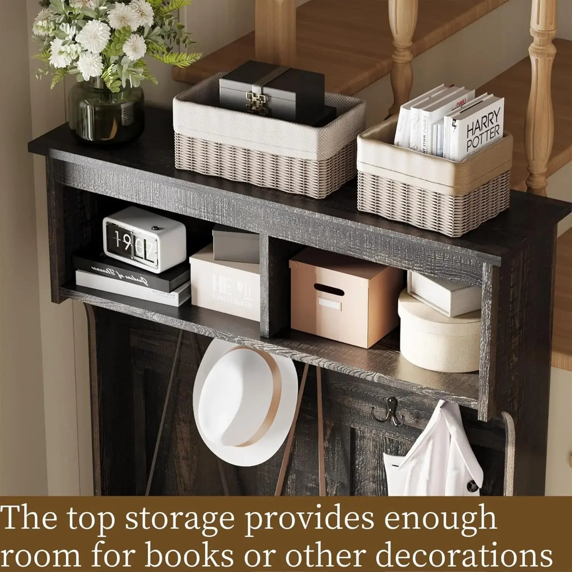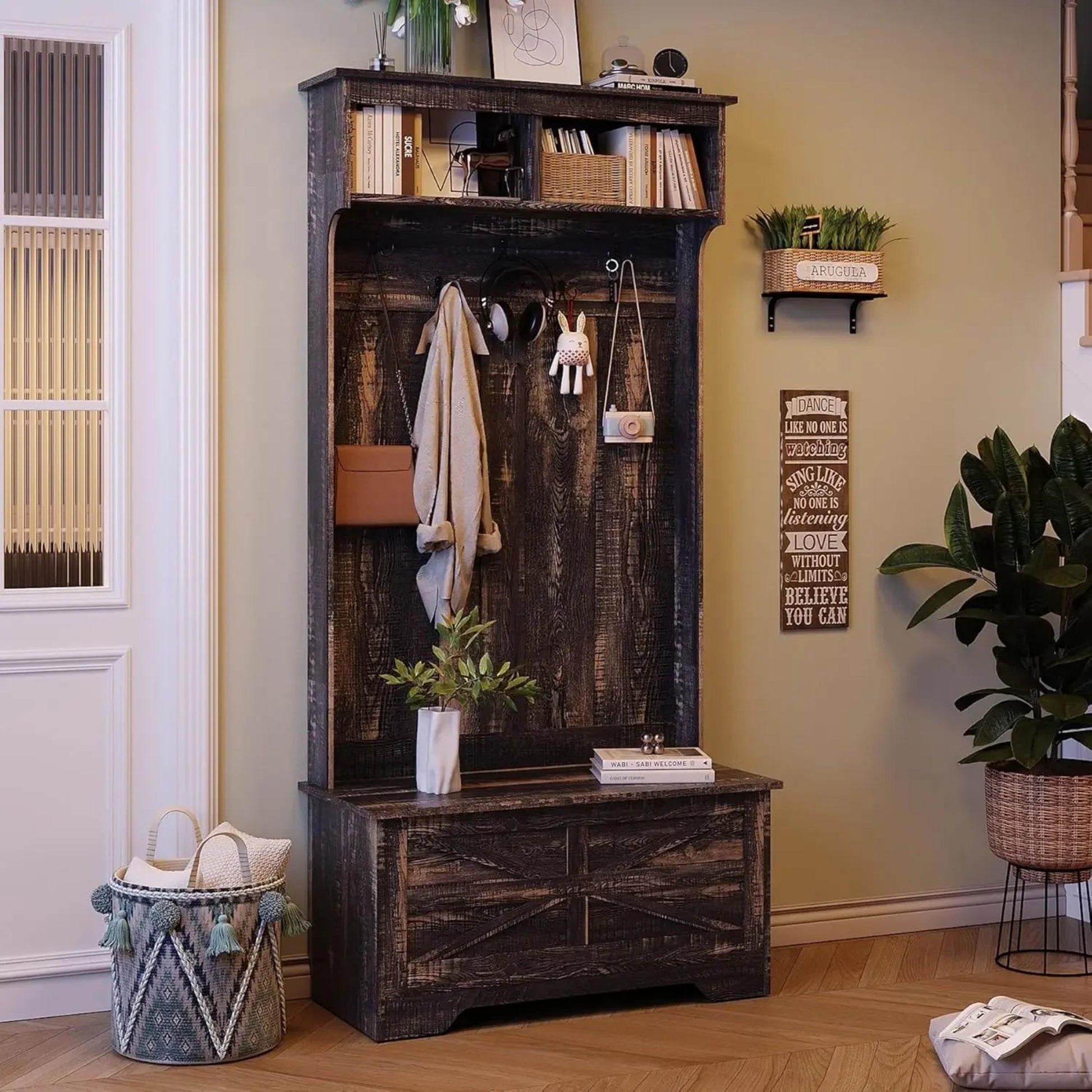 - [Versatile Storage Solutions]: This multifunctional hall tree is designed to meet your various needs. The top dividers provide a space for displaying potted plants, photo albums, or other decorative items, while the five hooks offer convenient storage for hats, pet leashes, and bags. Additionally, the bottom flap storage cabinet provides ample space for organizing your belongings