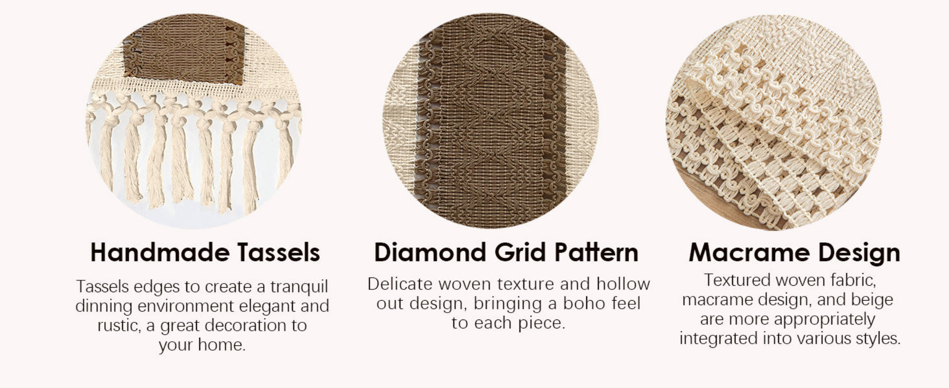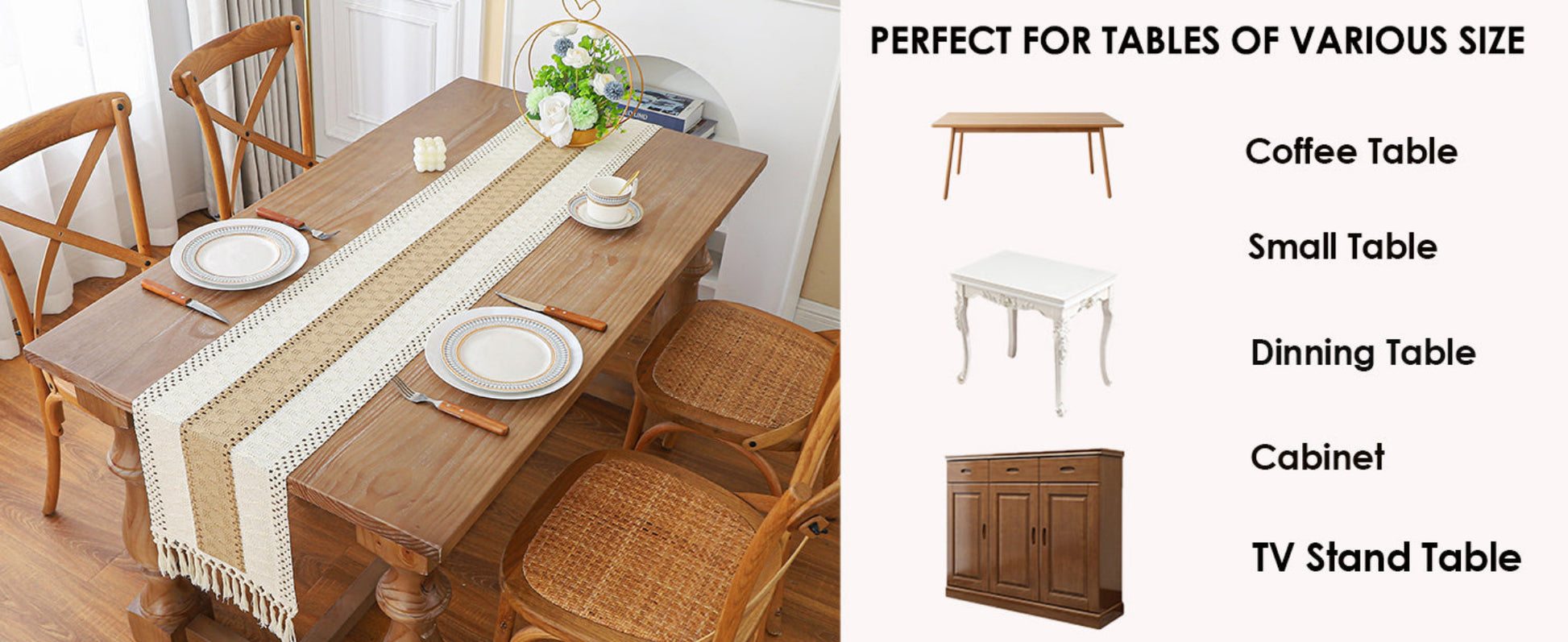 Boho Home Decor The farmhouse table runner is not only suitable for boho dining room decor, house decor, kitchen decor, bedroom decor, book desk, storage table, coffee tables, but also good for piano top, TV stand, bookshelf, and more places