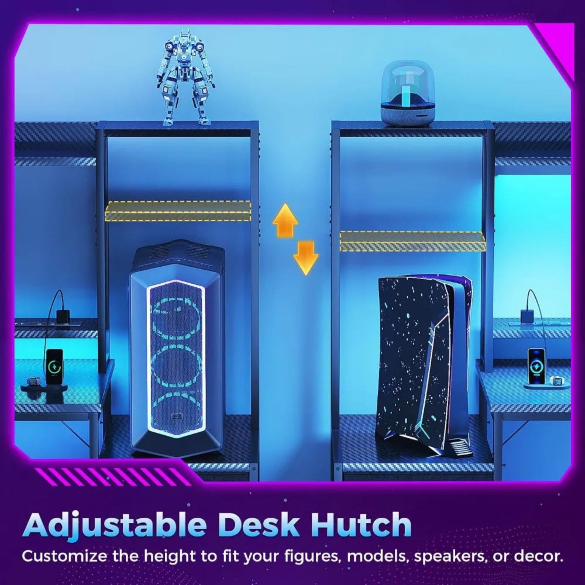 Gaming Desk with Hutch & Fabric Drawers, Computer Desk with USB Ports & LED Li